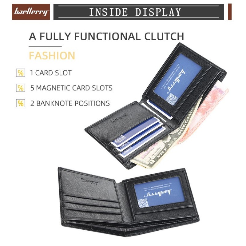 The brand "BAELLERRY" offers a men's wallet made primarily of PU (synthetic leather). This short wallet is lightweight, weighing 110 grams, and has a sleek and fashionable design. It includes various interior compartments for organizing your essentials, including coins, notes, photos, and cards. The wallet's dimensions are 12cm in length, 9.5cm in width, and 2cm in height. It does not have a zipper closure and features a solid pattern, making it a practical and stylish choice for men.