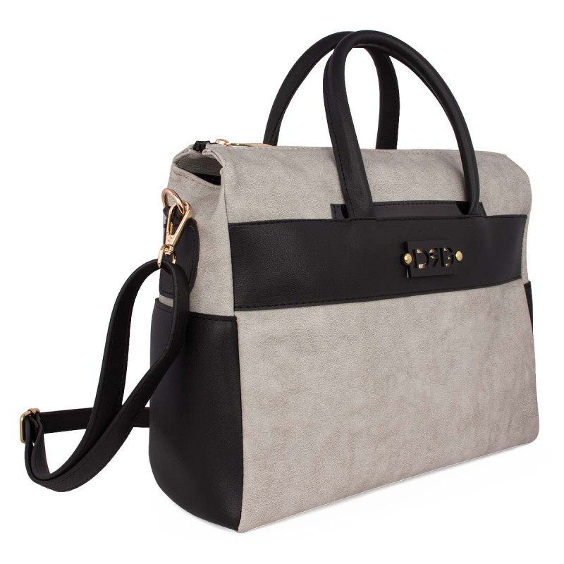 Ice-colored Shoulder Bag, made from eco-friendly leather with a leather absorbent and breathable lining. It features 2 internal pockets, one with a zipper. Adjustable and removable shoulder strap. Dimensions: H: 26cm, W: 34cm, D: 15cm.